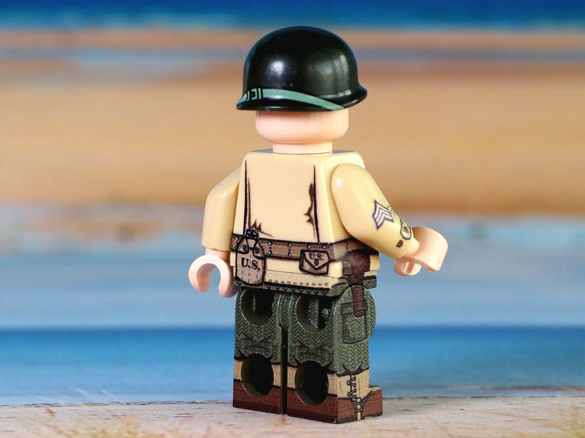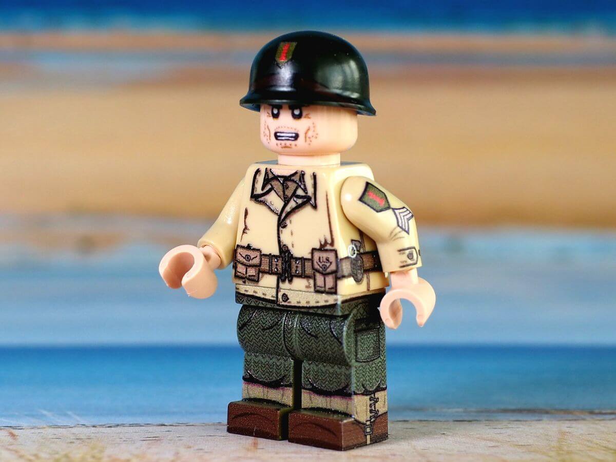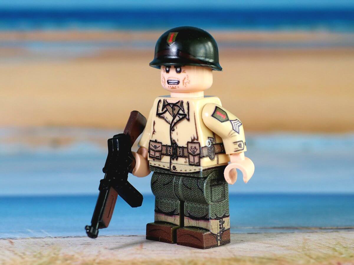 The minifigure of the infantryman of the 1st Infantry Division of the US Army by Italianminifig is sold complete with the typical M1 helmet bearing the print of a red "1" on an olive green background on the front. The uniform, rich in details and 360° printed on original Lego, is the one supplied during the Second World War.